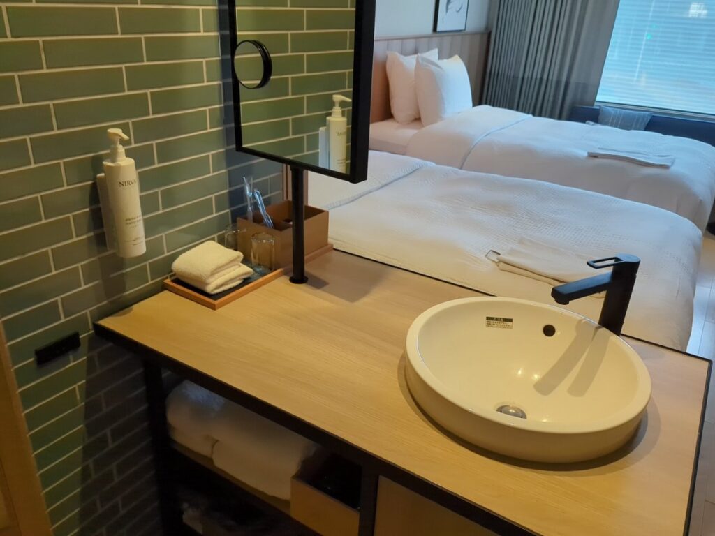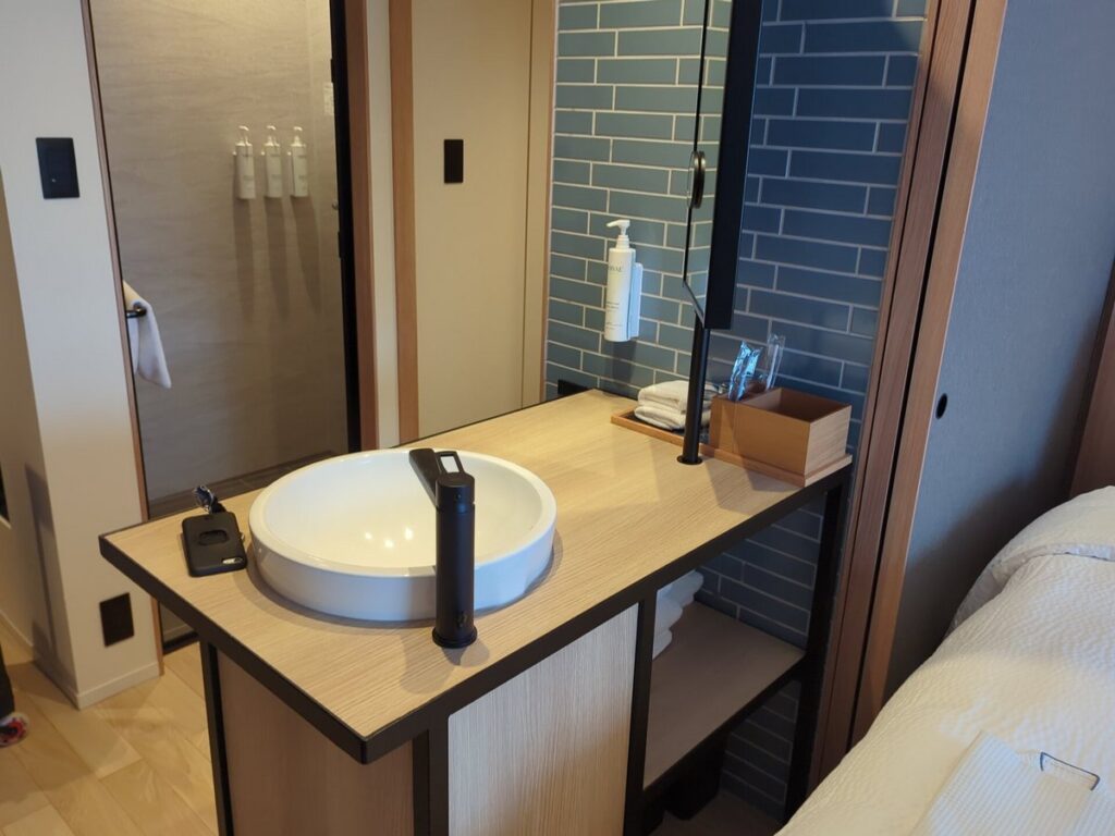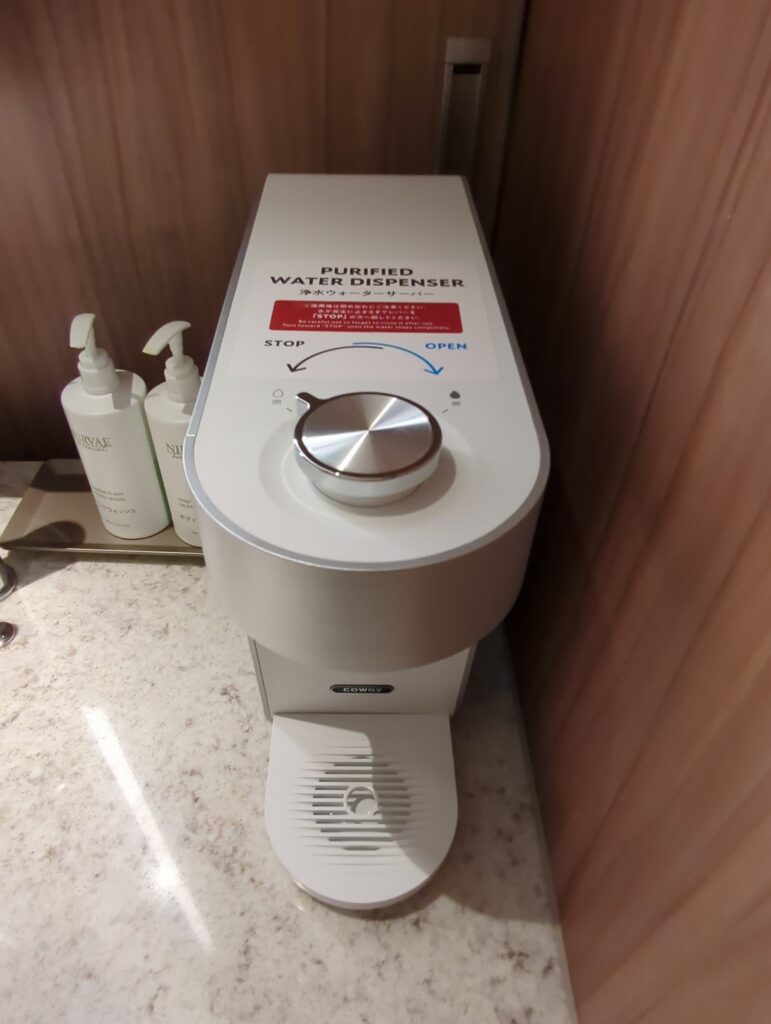 洗面スペースとベッドルームの間は 引き戸で仕切れる設計 になっています。アメニティは一通りのものがあります。また浄水器が設置されておりコーヒーを入れる際に重宝します。