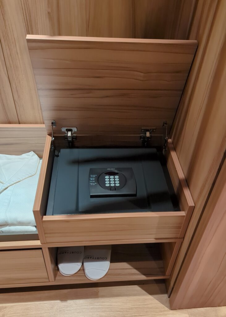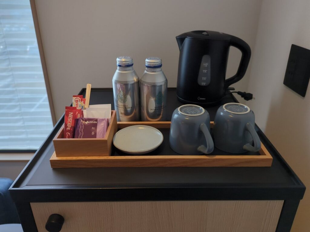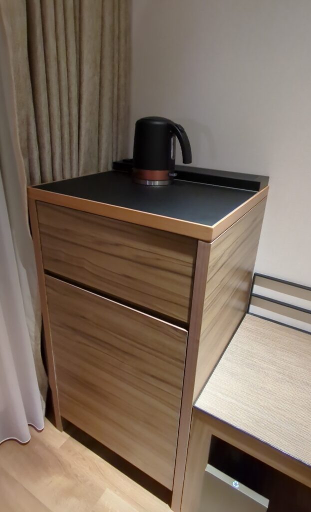 設備面では、必要なものがしっかり揃っています。 室内には 小型の冷蔵庫とセーフティボックス が備え付けられており、長めの滞在や貴重品管理にも安心。カウンターには 電気ケトル、ミネラルウォーター、インスタントコーヒー、紅茶 が置かれていて、到着後に一息入れたい時や朝の身支度の際に役立ちます。