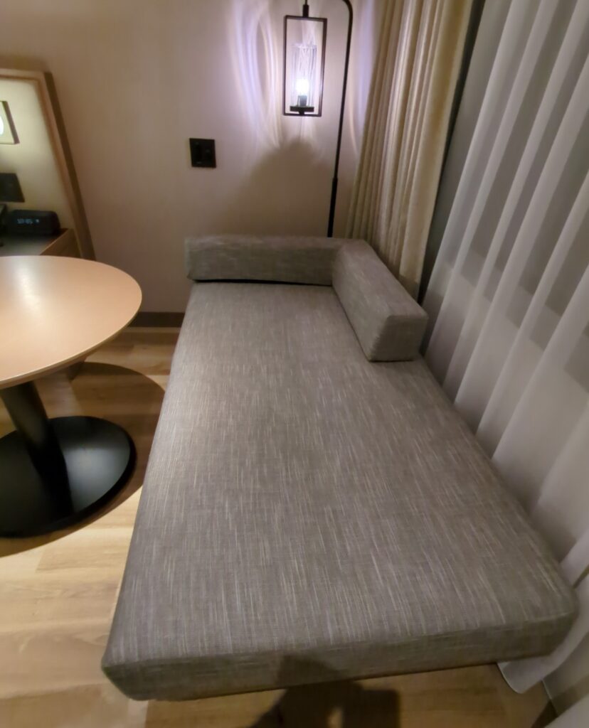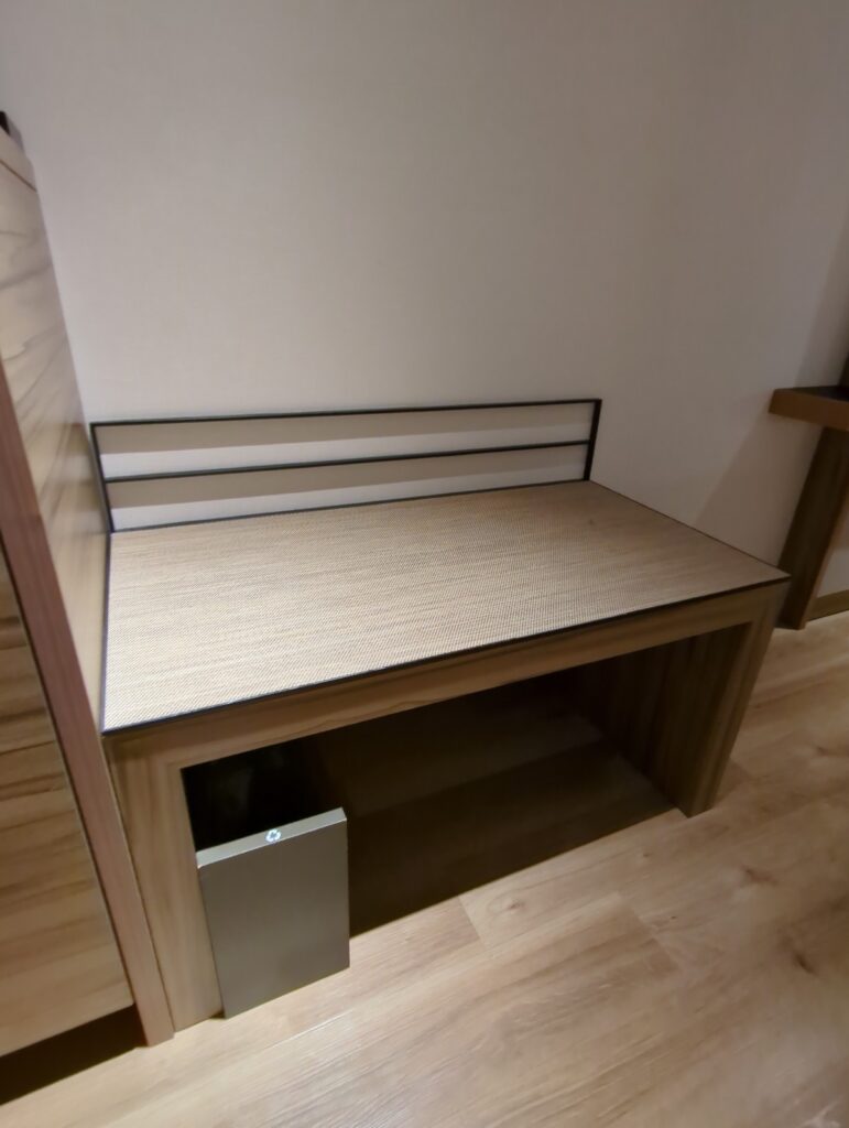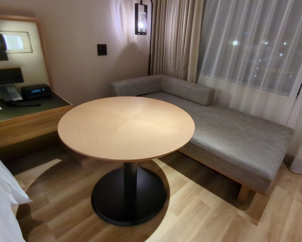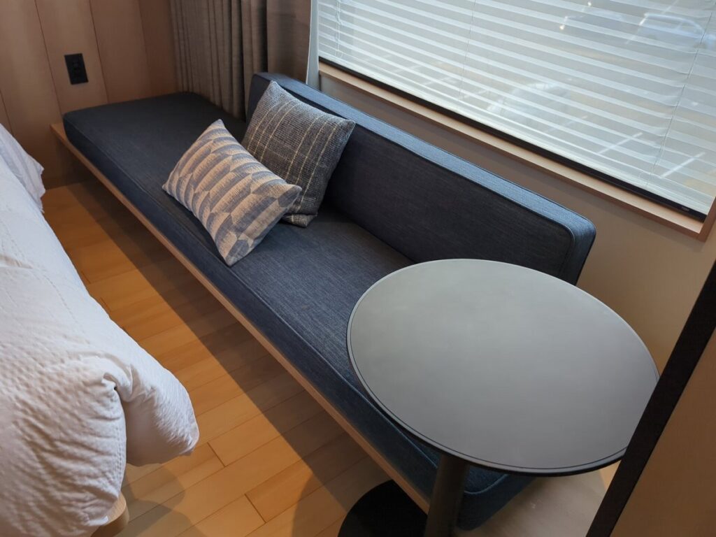 室内には、ベッドサイドに 細長いベンチ が備え付けられており、荷物置き場としても腰掛けとしても便利です。作業向けには 移動可能な丸テーブル が用意されています。一般的なビジネスデスクはありませんが、ソファに座ってノートPCを開いたり、旅の計画を立てたりするにはちょうど良いサイズ感です。