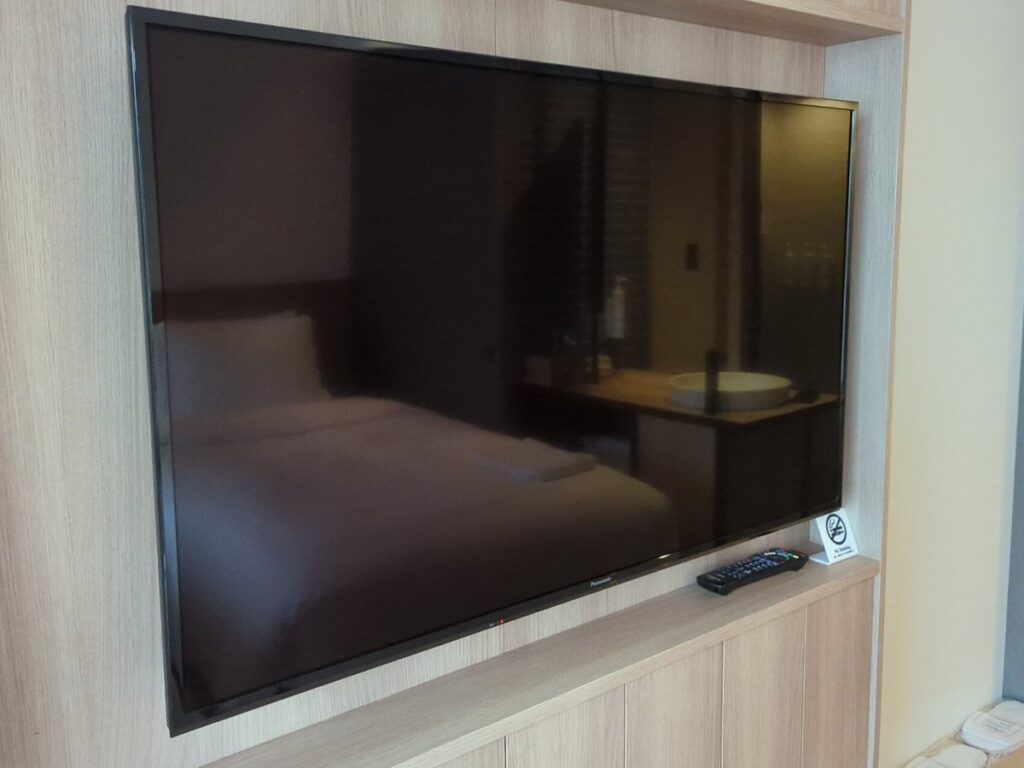コートヤード名古屋の客室は、木を基調にしたモダンな雰囲気で、全体として落ち着きがあります。ベッドの前には大型テレビと空気清浄機が設置されています。