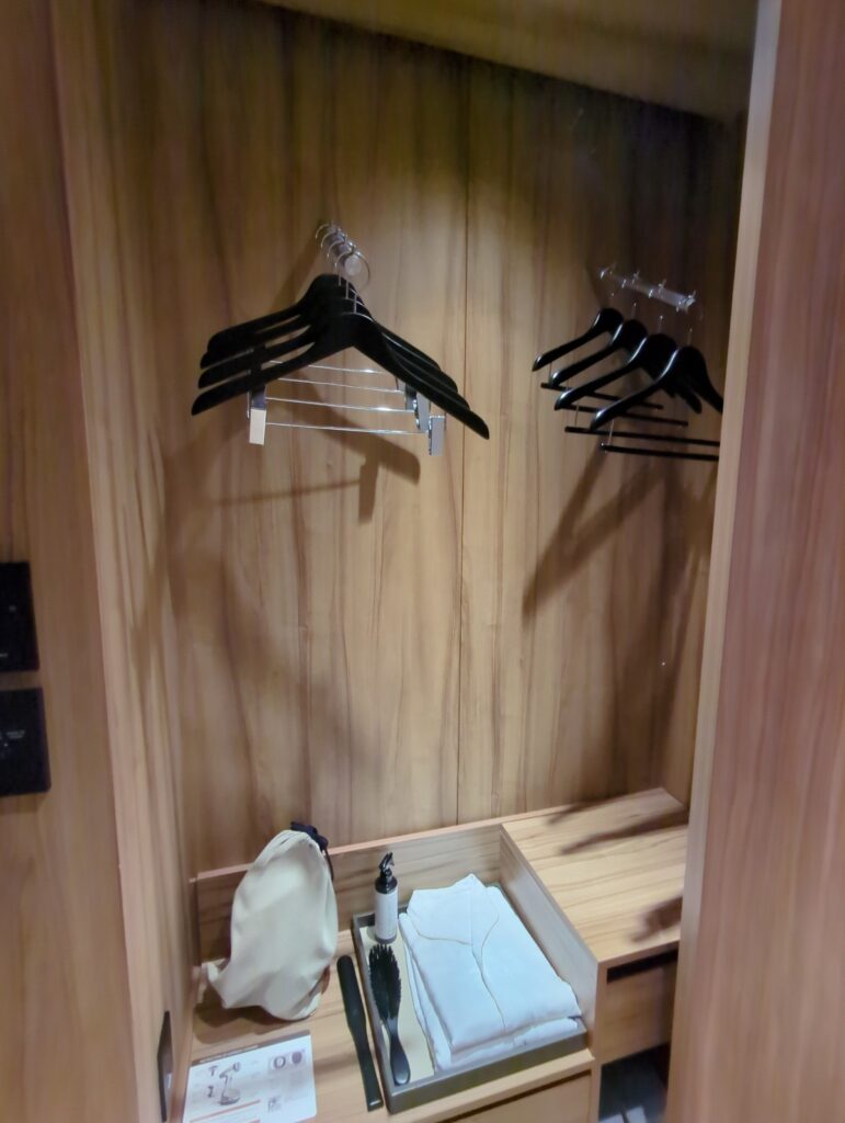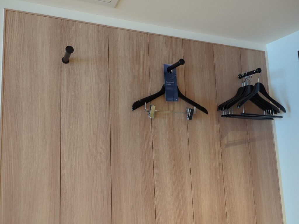 収納スペースはクローゼット式ではなく、壁面にハンガーを掛ける オープンクローゼットタイプ。短期滞在向けのミニマルな設計ですが、意外と使い勝手がよく、必要なものがすぐ取りやすい点が便利です。さらに、荷物整理に便利な 折りたたみ式のラゲッジラック(スーツケース置き) があり、床に置かずにスーツケースを開けられるのも嬉しいポイント。腰への負担も減り快適です。