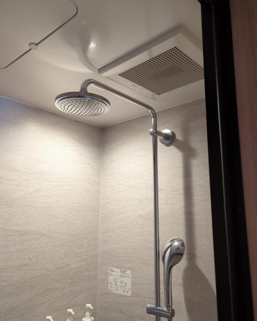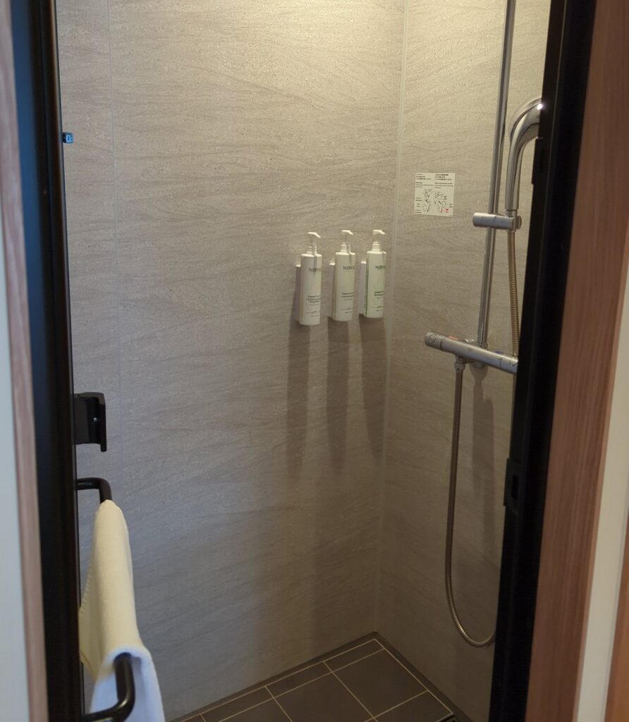 バスルームは バスタブなし・シャワーブースのみ のスタイル。レインシャワーの水圧も十分で、短時間でもしっかりリフレッシュできます。トイレは独立で引き戸があります。