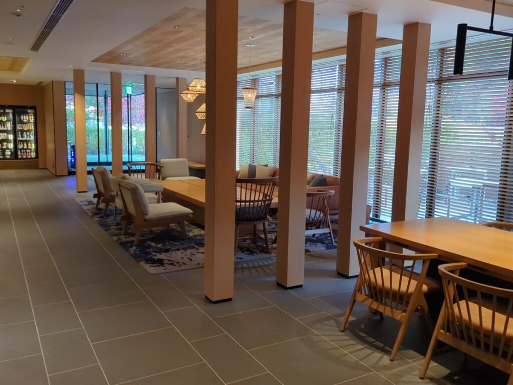 フロントフロアには、食事や仕事など幅広い用途に使える 広めのテーブルスペース が設けられており、ロビーでゆっくり過ごすことができます。客室以外でちょっと作業したい時や、道の駅で買ったものをすぐ食べたい時にも便利な場所です。