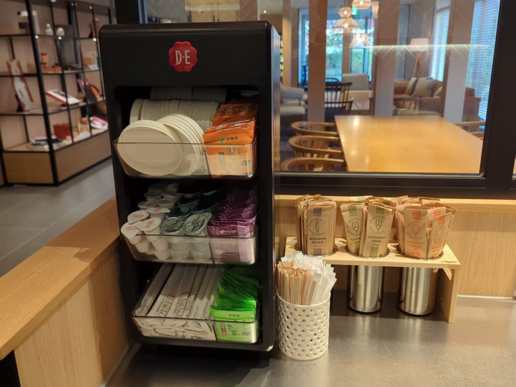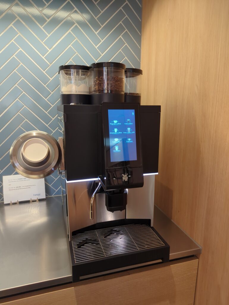 無料のドリンクステーションも充実しており、 カフェラテまで作れるコーヒーマシン が置かれています。紅茶や日本茶のティーバッグ、カトラリー類(フォーク・スプーンなど)も揃っているため、簡単な食事や軽い休憩の際に重宝します。ホテルにレストランがないというフェアフィールドのコンセプトを補う、とても嬉しいポイントです。