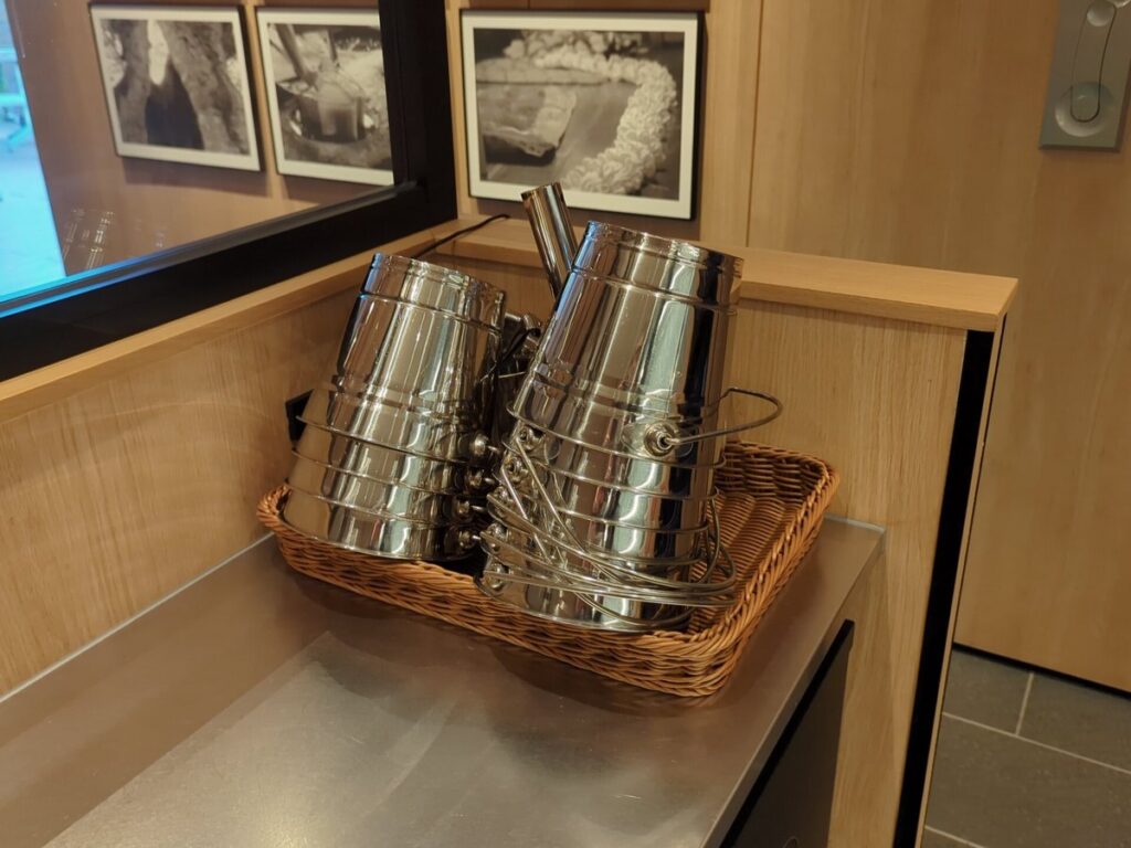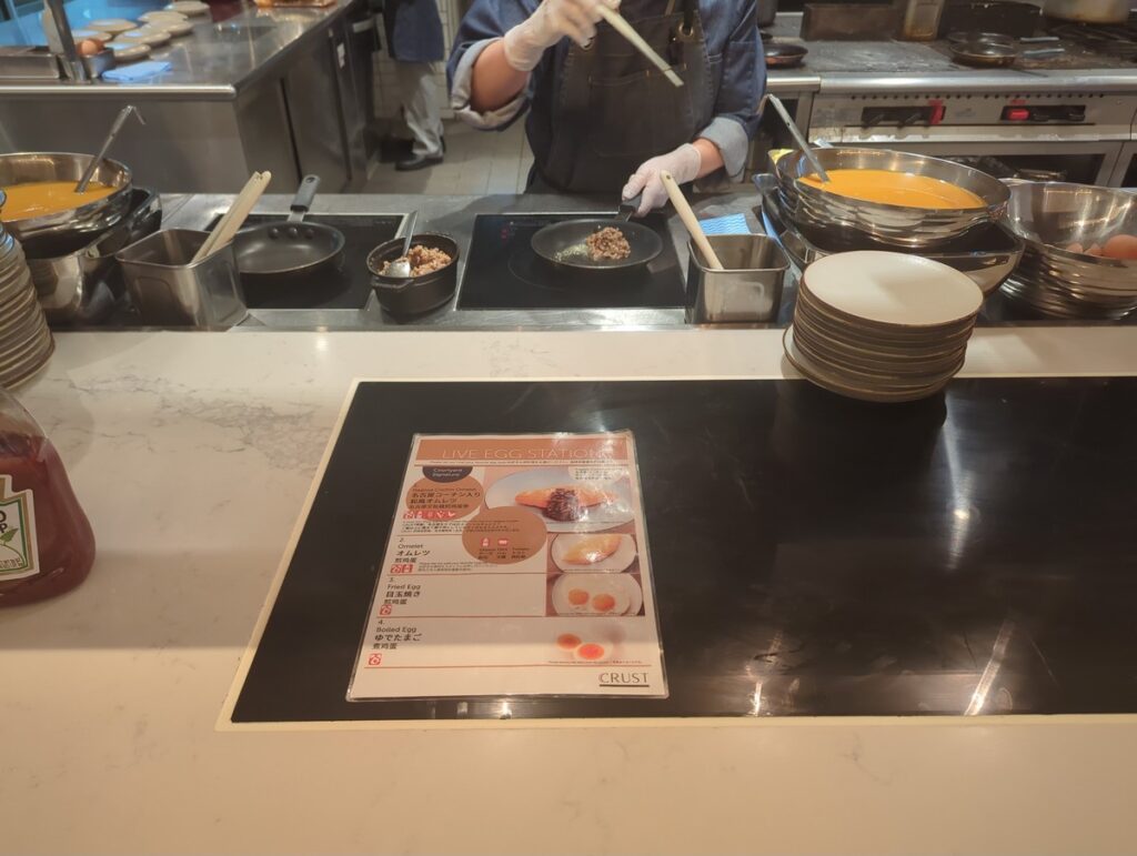 またライブキッチンでは定番の目玉焼きやオムレツだけでなく名古屋コーチンを使った和風オムレツやきしめんなども提供されており旅の気分を盛り上げてくれます。