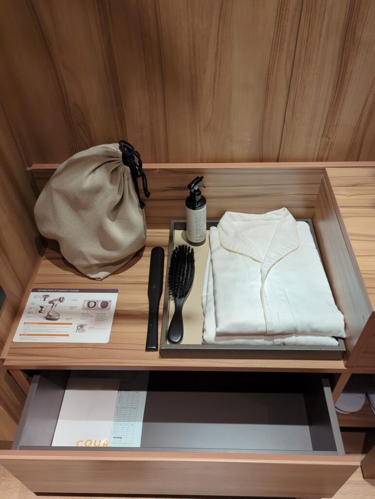 部屋着やスリッパ、衣類スチーマーなどもクローゼットに設置されています。