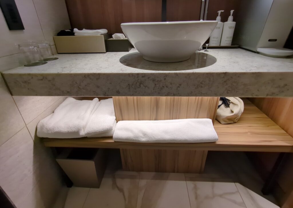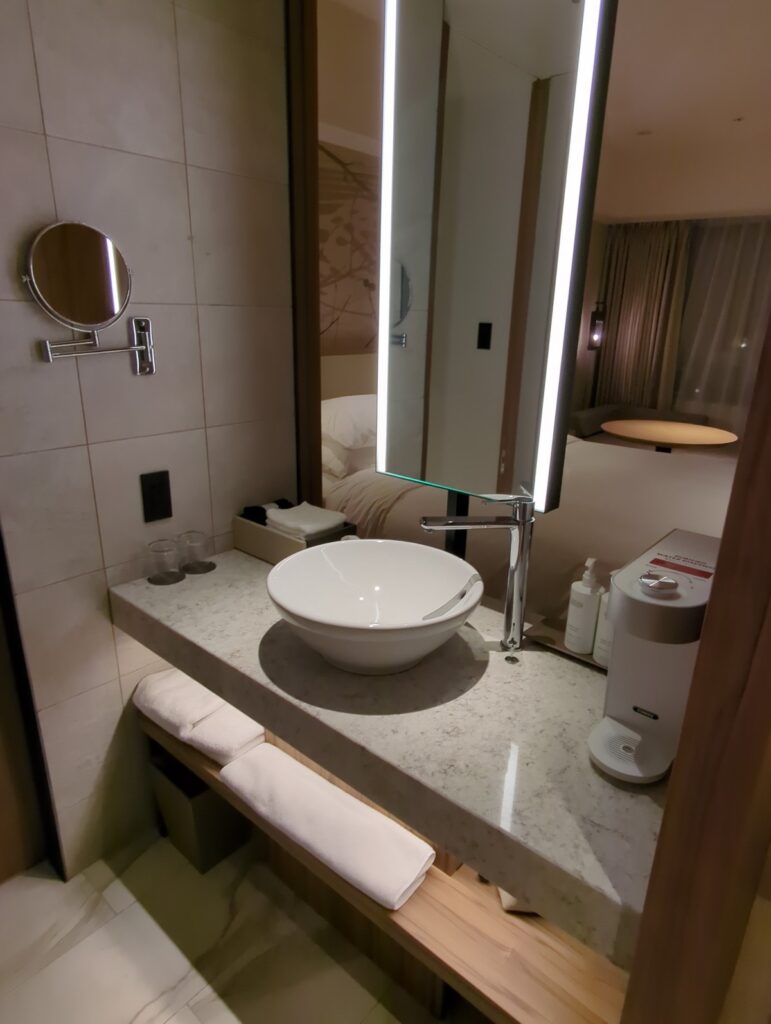 客室は作業もしやすいテーブルやソファ、引き戸で区切れる洗面スペースなど、都市型ホテルとして機能性が高く快適。バスタブはない部屋でしたが、レインシャワーもありシャワー派なら十分満足できるはずです。