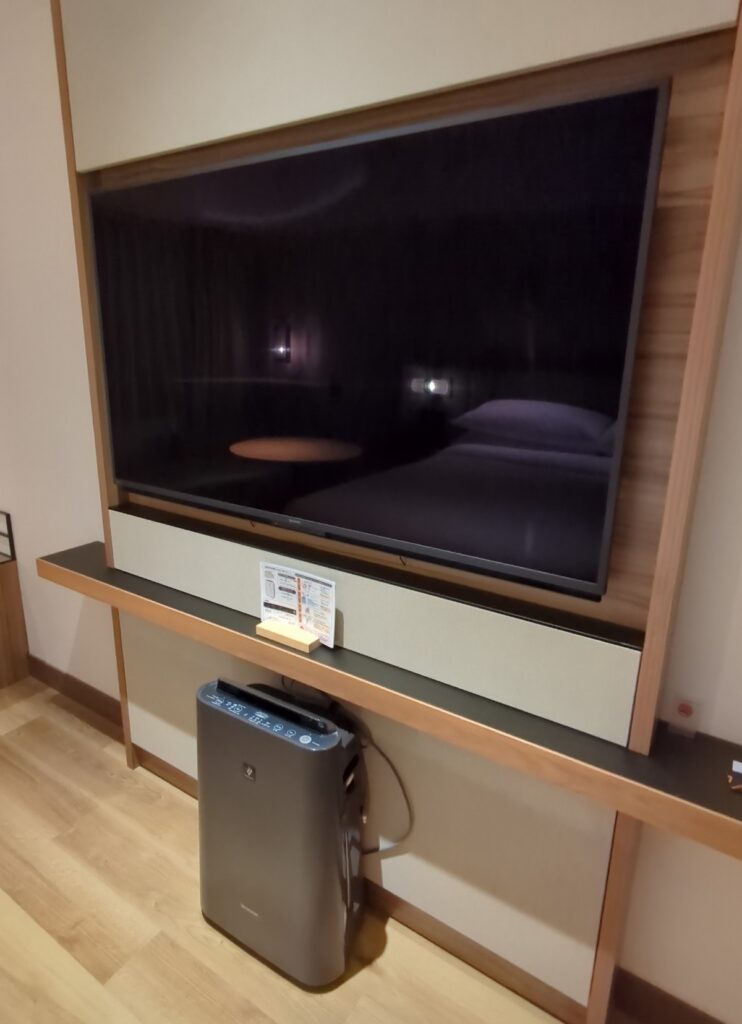 ベッド正面には大型テレビがありテレビの前には空気清浄機もあります。
