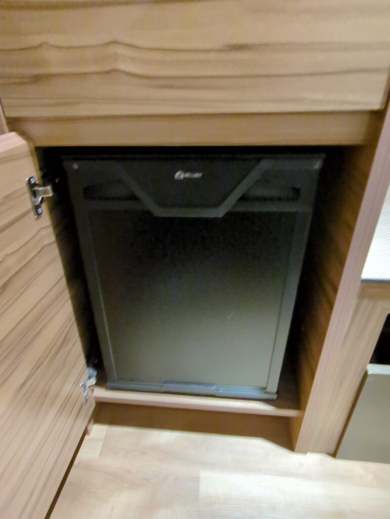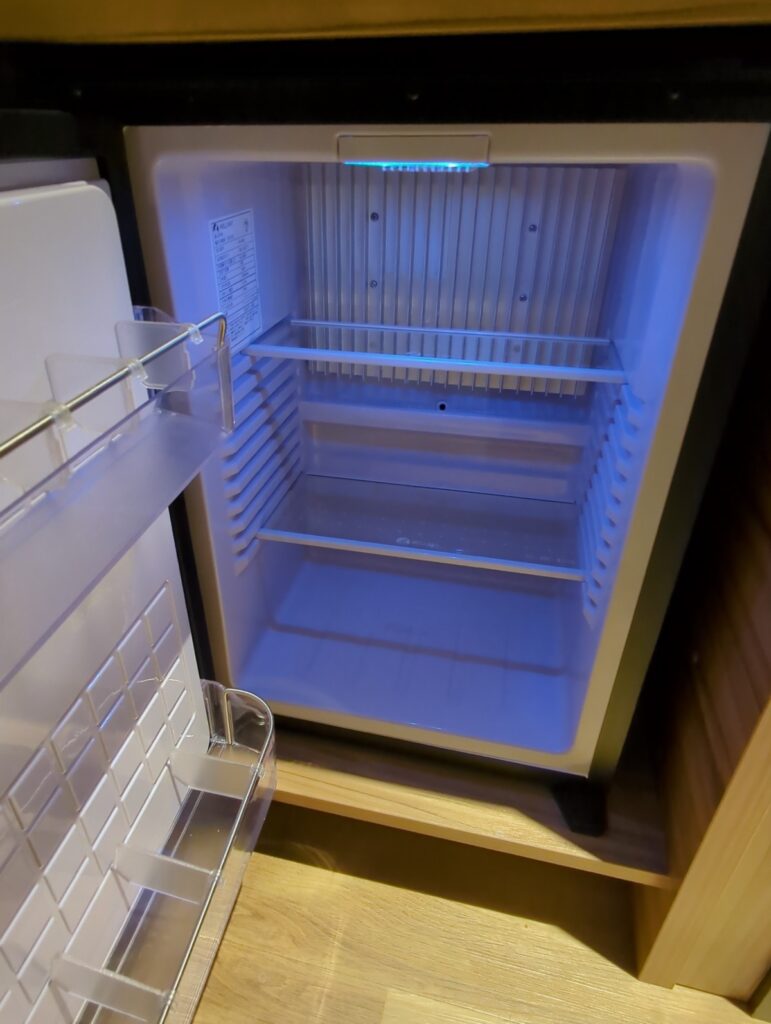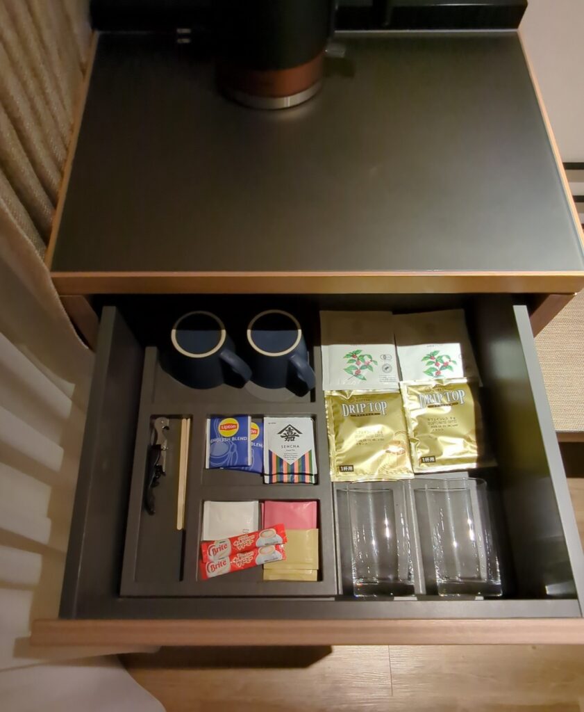 カウンタースペースにはには備え付けのスーツケース置き場があります。電気ケトルと冷蔵庫が設置され、引き出しの中にはインスタントコーヒーやお茶グラスやカップが収納されています。