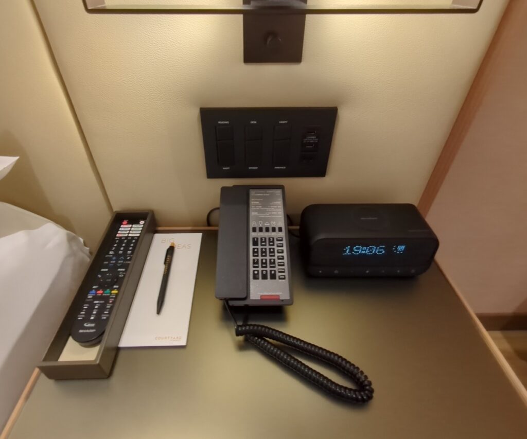 ベッドの間の壁に照明のスイッチ、コンセント、充電用USBポートが備えられています。